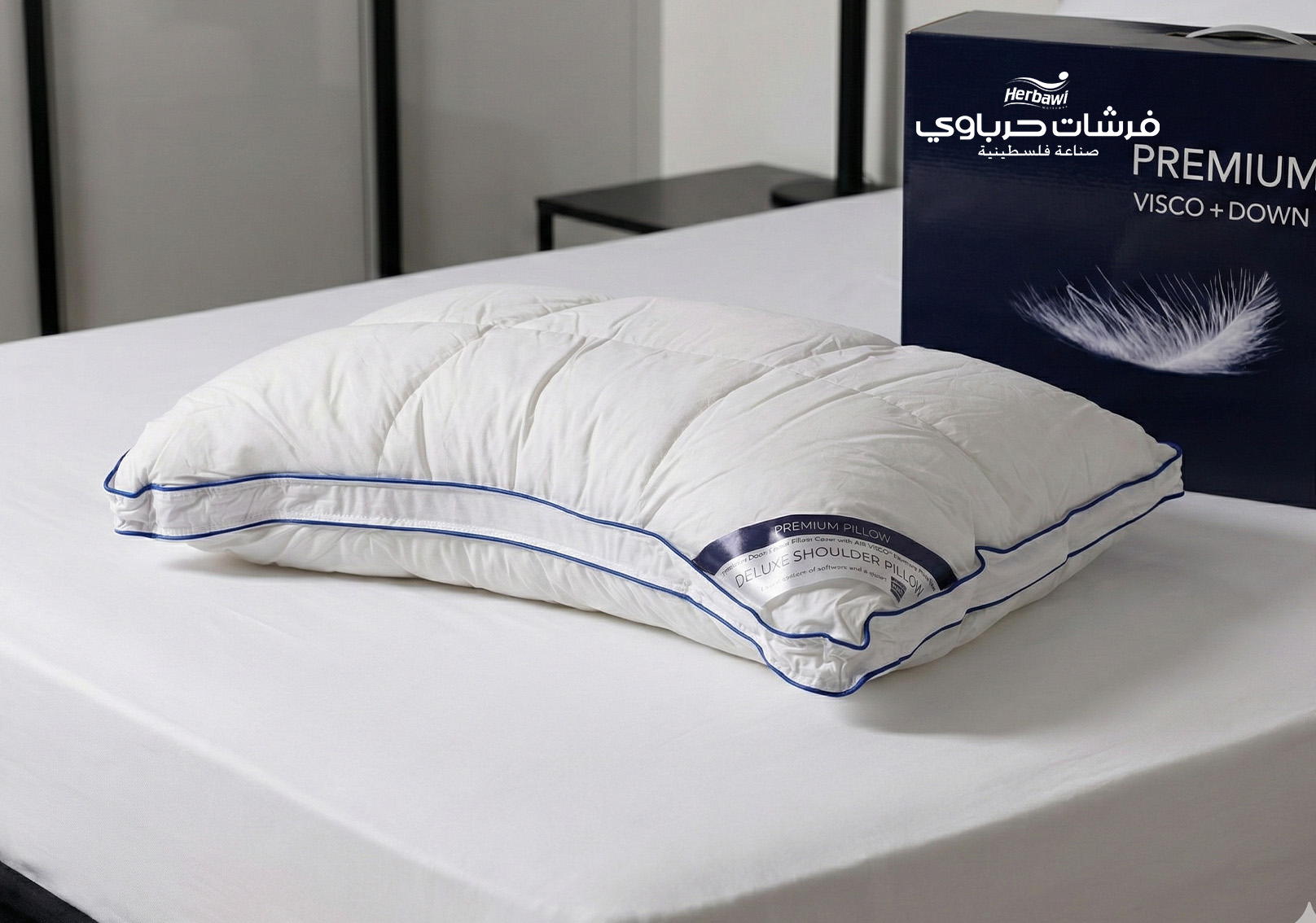 وجه مدرب مع طبقه من زغب الأوز الفاخر مع الأسفنج الذكي ( الميموري فوم ) يتماشى مع العنق والرأس ويوفر توزيع مثالي من نقاط الضغط لتخفيف آلام الرقبة، والإجهاد والأرق وانسيابيه بجريان الدورة الدمويه وخاصة لمن ينامون على الجنب .
