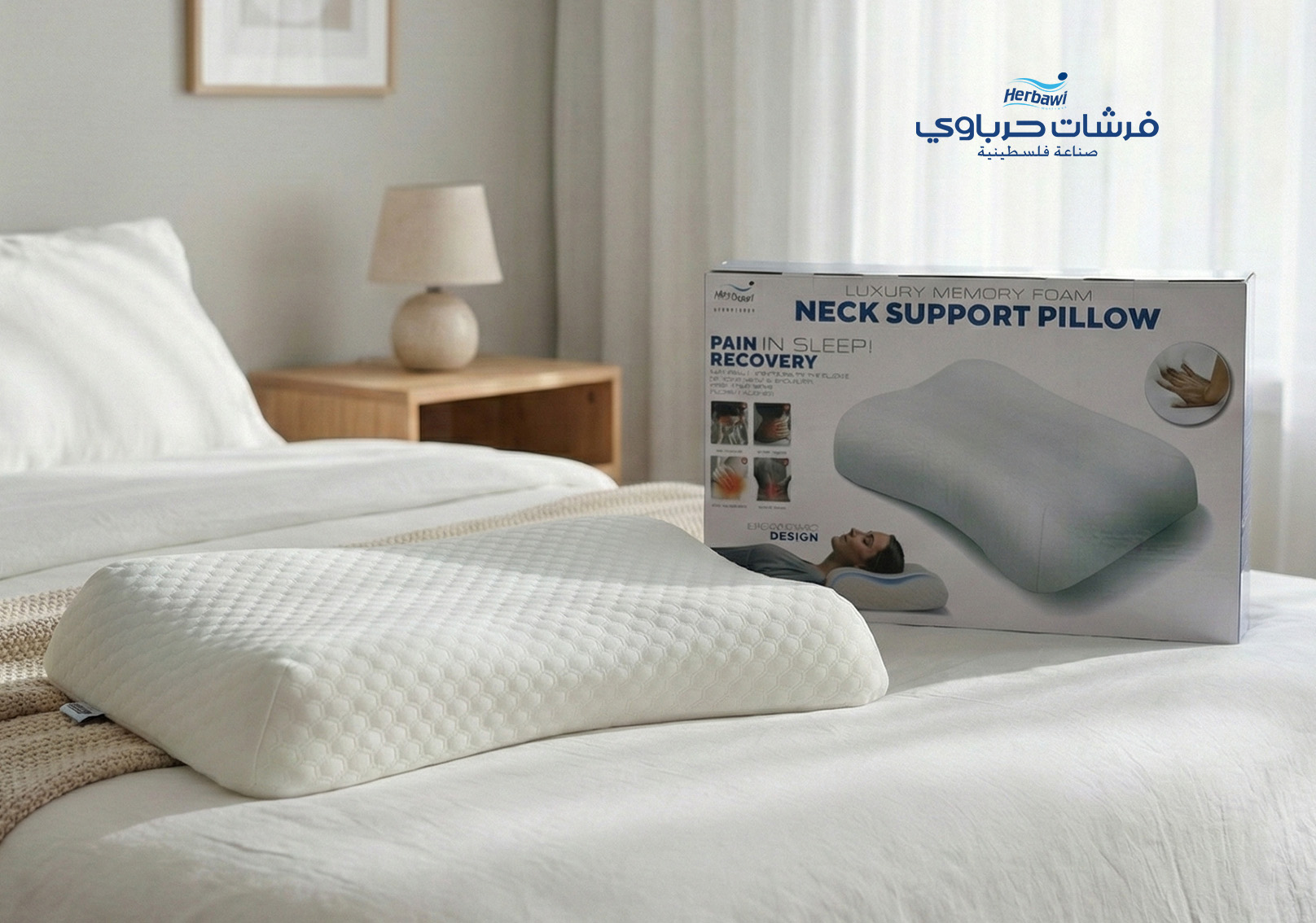 وسادة دعم الرقبة الجديدة من فرشات حرباوي مصممة من إسفنج الميموري فوم، مما يضمن دعماً مريحاً يتكيف مع شكل الرأس والرقبة لتوفير أقصى درجات الراحة.